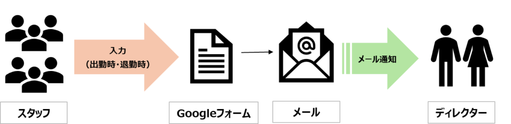 Googleフォームで入力 → スプレッドシートで集計 → 自動メール通知というシンプルな流れです。